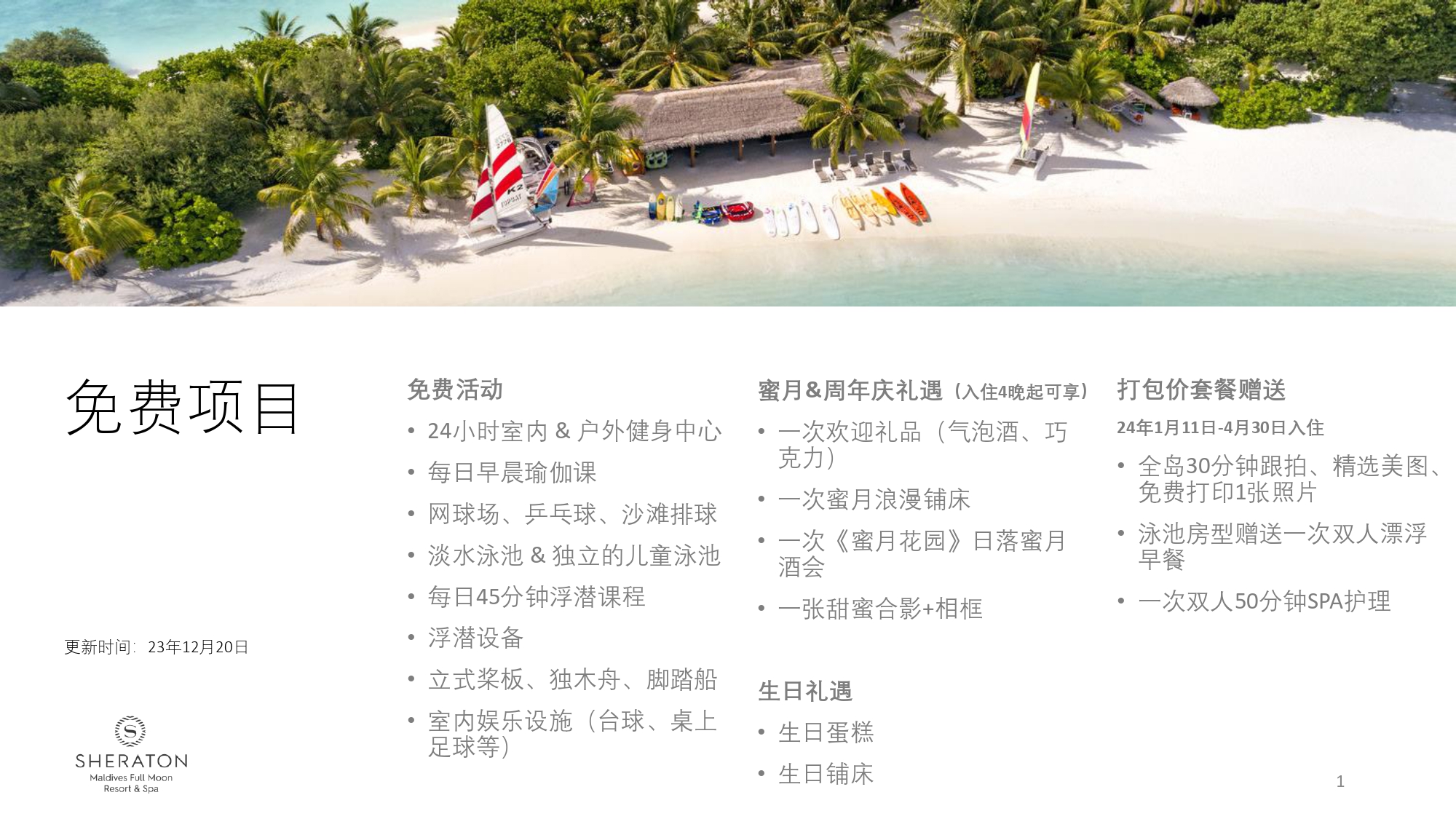 路线名称:【海岛度假】马尔代夫喜来登满月岛自由行*一价全包+四晚酒店住宿+含三餐饮料+上岛接送+Spa体验