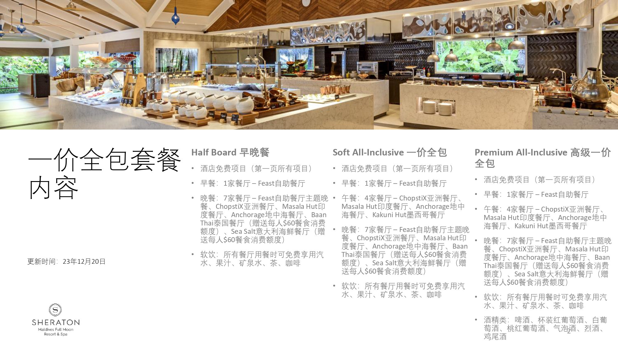 包括每日早餐、午餐和晚餐。Feast 提供自助早餐。午餐客人可以选择在 ChopstiX, Anchorage, Kakuni Hut 和 Masala Hut 用餐,包括三道菜用餐(前菜、主菜、甜点)在这些场所按单点。晚餐在 Feast 供应自助餐,或者客人可以在这些特色餐厅之一品尝丰盛的三道菜大餐(前菜,主菜,甜点):Anchorage, ChopstiX 或 Masala Hut。选择在 Baan Thai 和海盐餐厅用餐的客人,每人可获得 60 美元的用餐抵用券,仅适用于食品。迷你吧包括:每日补充一次软饮料,啤酒,葡萄酒,小吃续杯。